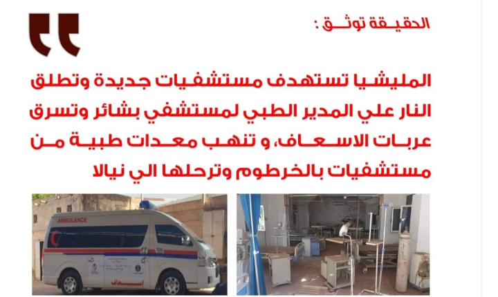في اطار استهدافها المستمر للقطاع الصحي قامت مليشيا الدعم السريع بنهب المعدات الطبية من مستشفيات”سوبا الجامعي،بن سينا،الزيتونة”.وترحلها عبر جرارات الي مستشفي نيالا.