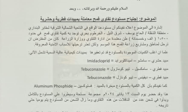 وكشفت الشركة في خطاب أطلعت عليه “اليوم التالي” عن استيلاء مسلحون على مستودعها الواقع في الناحية الشمالية الشرقية لمقابر البنداري منطقة الشقلةالحاج يوسف شرق النيل _الخرطوم بحري والذي توجد به كمية تقاوي قمح في حدود (1,500) الف وخمسمائة طن معتمدة من ادارة التقاوي وزارة الزراعة.