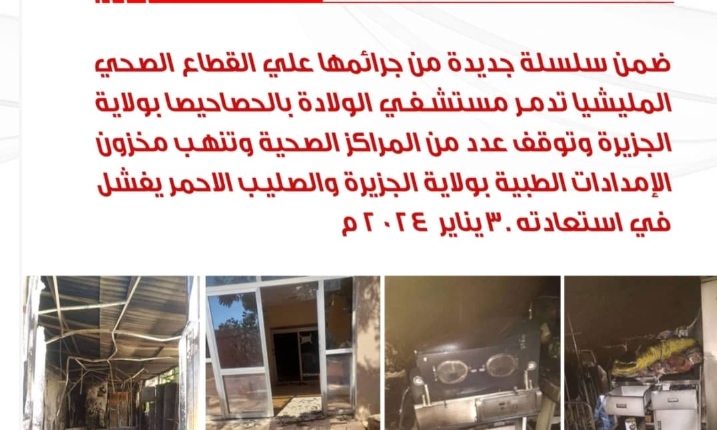 ضمن سلسلة جديدة من جرائمها علي القطاع الصحي المليشيا تدمر مستشفي الولادة بالحصاحيصا بولاية الجزيرة وتوقف عدد من المراكز الصحية وتنهب مخزون الإمدادات الطبية بولاية الجزيرة والصليب الاحمر يفشل في استعادته