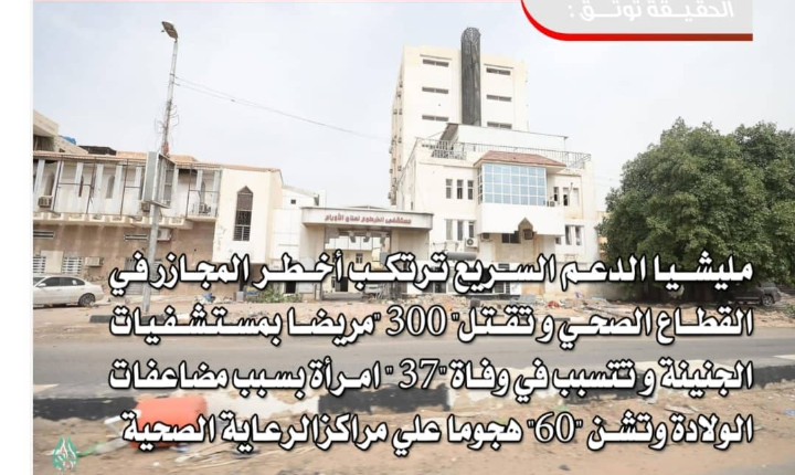 مليشيا الدعم السريع ترتكب أخطر المجازر في القطاع الصحي- تقتل” ٣٠٠ “مريضا بمستشفيات الجنينة و تتسبب في وفاة”٣٧ ” امرأة بسبب مضاعفات الولادة وتشن “٦٠”هجوما علي مراكز الرعاية الصحية