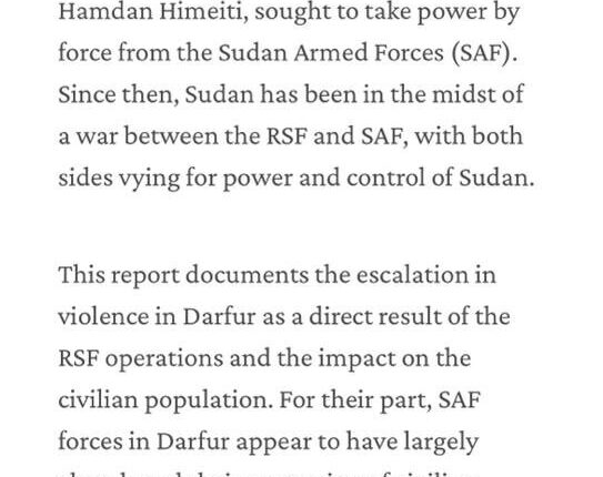 يوثق هذا التقرير استمرار الأنماط التاريخية للهجمات والعنف ضد مجموعات عرقية محددة في دارفور خلال الفترة من 15 أبريل 2023 إلى 10 يوليو 2023. وتتطابق أنماط الهجوم التي نفذتها قوات الدعم السريع والقوات المتحالفة مع الفظائع والجرائم التي ارتكبتها الحكومة السودان وميليشيات الجنجويد في عامي 2003 و2004. ومن خلال استهداف المجتمعات والبنية التحتية من أجل الحفاظ على الحياة، عادت قوات الدعم السريع إلى قواعد اللعبة التي استخدمتها الجنجويد في الفترة 2003-2004. منذ 15 أبريل 2023،