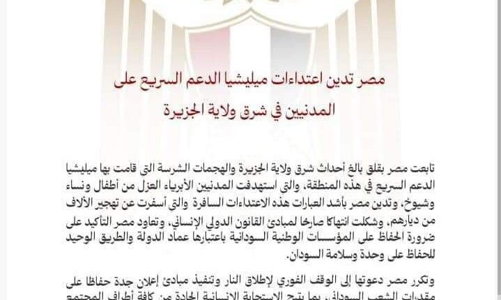 - تابعت مصر بقلق أحداث شرق ولاية الجزيرة والهجمات الشرسة التي قامت بها مليشيا الدعم السريع والتي استهدفت المدنيين العزل من أطفال ونساء وشيوخ