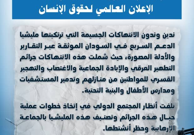 ندين وندون الانتهاكات الجسيمة التي ترتكبتها مليشيا الدعم السريع في السودان الموثقة عبر التقارير والأدلة المصورة،حيث شملت هذه الانتهاكات جرائم التطهير العرقي والإبادة الجماعية والاغتصاب والتهجير القسري للمواطنين من منازلهم وتدمير المستشفيات ومدارس الأطفال والبنية التحتية.