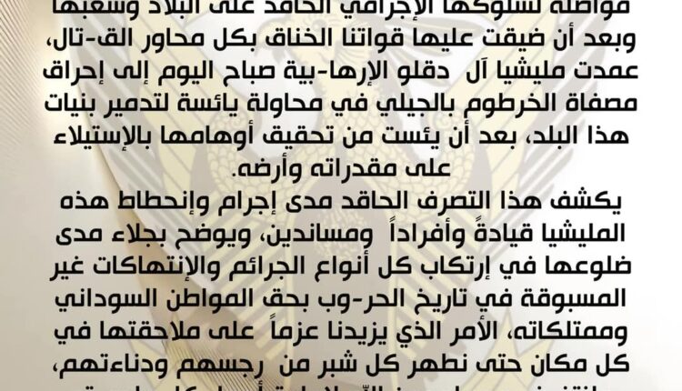 In continuation of its criminal and hateful behavior towards the country and its people, and after our forces tightened the noose on it on all combat fronts, the terr-orist militia of Al-Dagalo deliberately set fire to the Khartoum refinery in Al-Jaili this morning in a desperate attempt to destroy the infrastructures of this country, after despairing of achieving its illusions of seizing its resources and land.