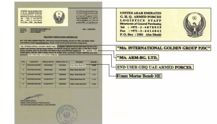 إلا أن مصدرا فضل عدم ذكر هويته، مد فريق تحرير مراقبون بنسخة من شهادة التوصيل المذكورة آنفا. وتم إصدار هذه الوثيقة في يوم 16 آب/أغسطس 2020 من قبل القيادة العامة للقوات المسلحة في الإمارات العربية المتحدة والتي كانت مليئة بالمعلومات القيمة حول عملية التسليم. ونعلم من خلال هذه الوثيقة أن الطرف الأخير المستلم لقنابل الهاون بلغارية الصنع هو جيش الإمارات العربية المتحدة نفسه.