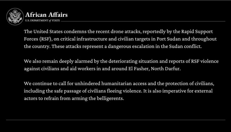 تُدين الولايات المتحدة الهجمات الأخيرة بطائرات مُسيّرة، والتي أفادت التقارير بشنها من قِبل قوات الدعم السريع، على البنية التحتية الحيوية وأهداف مدنية أخرى في بورتسودان وفي جميع أنحاء البلاد. تُمثل هذه الهجمات تصعيدًا خطيرًا في الصراع السوداني.