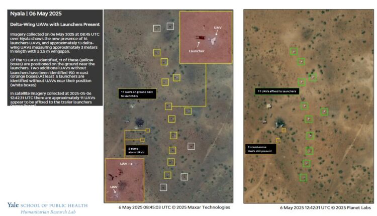 حدّد مختبر الأبحاث الإنسانية التابع لكلية ييل للصحة العامة وجود 13 طائرة مسيّرة ذات أجنحة دلتا (UAVs) و16 منصة إطلاق قرب مطار نيالا الخاضع لسيطرة قوات الدعم السريع، وذلك في صور أقمار صناعية أرشيفية جُمعت بين 1 و6 مايو 2025. الطائرات الـ13 التي رُصدت خارج نيالا تتطابق مع ذخائر متسكّعة من طراز شاهد-136، وربما تكون من نوع Sunflower-200 أو ZT-180، والتي يتراوح مداها عادةً بين 1500 و2000 كيلومتر. ويتزامن هذا مع سلسلة هجمات بطائرات مسيّرة استهدفت بورتسودان بين 3 و7 مايو 2025، نفذتها طائرات أطلقتها قوات الدعم السريع، على بُعد نحو 1600 كيلومتر من نيالا. أما منصات الإطلاق الـ16 قرب مطار نيالا فهي موجودة في جميع صور الأقمار الصناعية المتوفرة حتى 5 سبتمبر 2025 على الأقل.