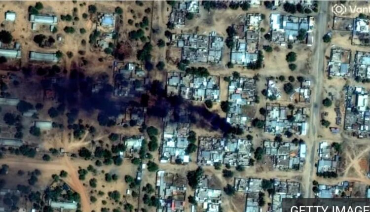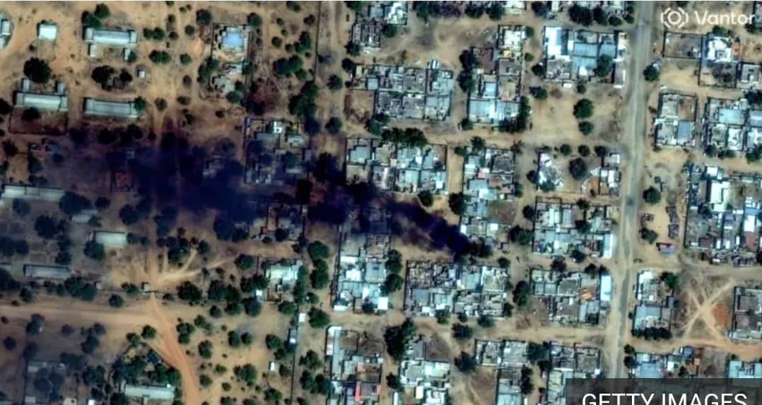 تُظهر صور الأقمار الصناعية المُقرّبة من فانتور دخاناً أسود كثيفاً يتصاعد من حريق في منطقة سكنية بالقرب من مطار الفاشر. صدر الصورة،Getty Images