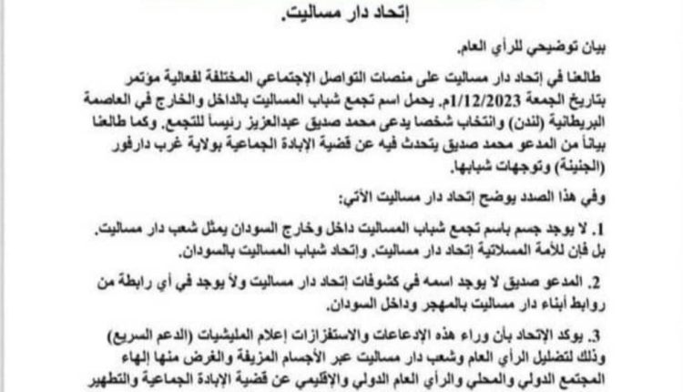 تبرأ اتحاد دار مساليت، من مؤتمر عقد في بريطانيا يحمل اسم تجمع شباب المساليت بالداخل والخارج، انتخب شخصا يدعى محمد صديق عبدالعزيز رئيسا للتجمع.